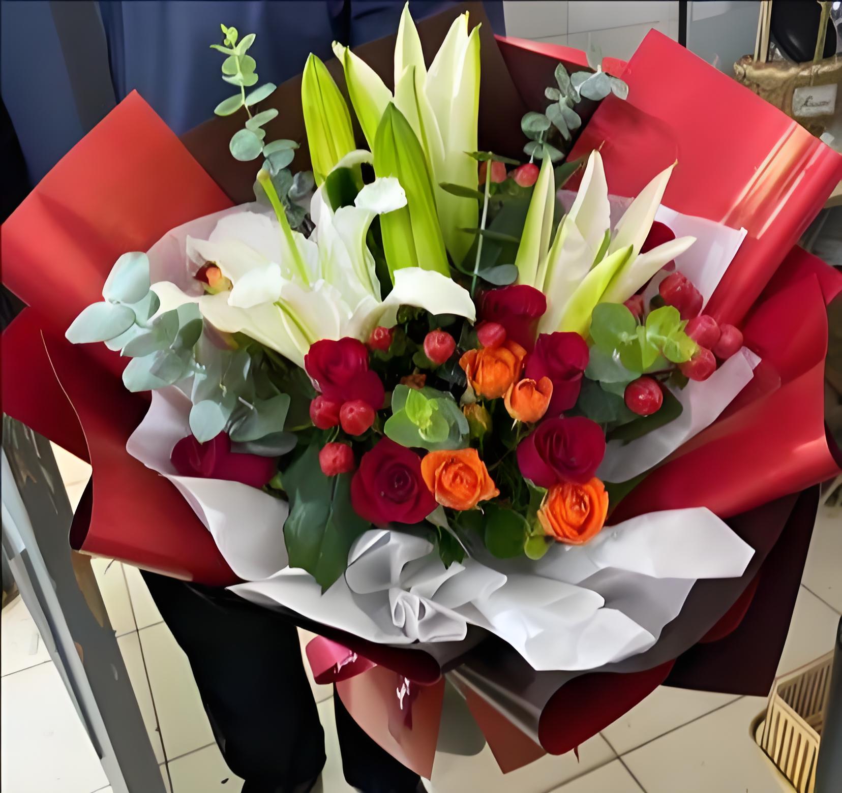 天津滨海新区花店包11枝红玫瑰、2枝多头白百合、6枝橙色多头玫瑰、红豆、尤加利叶
